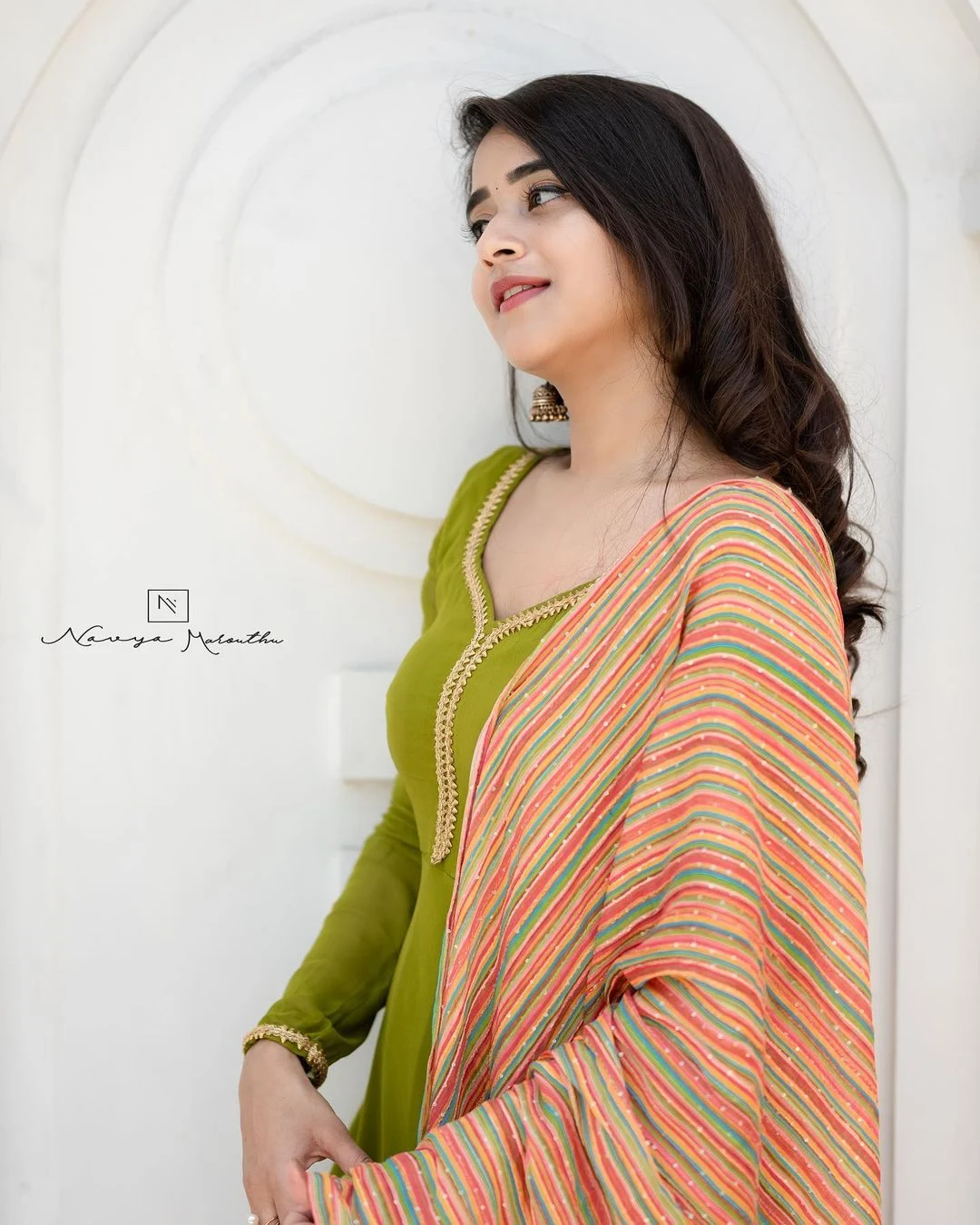 Actress Deepthi Sunaina Pics in green long frock Photos full sleeve with dupatta styled by Navya Marouthu.
